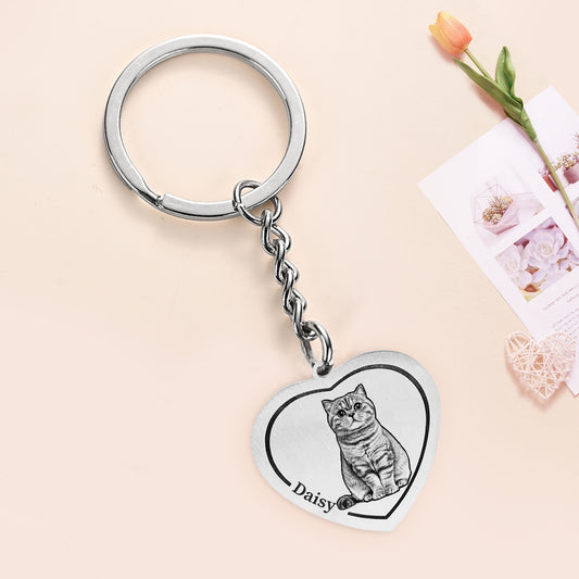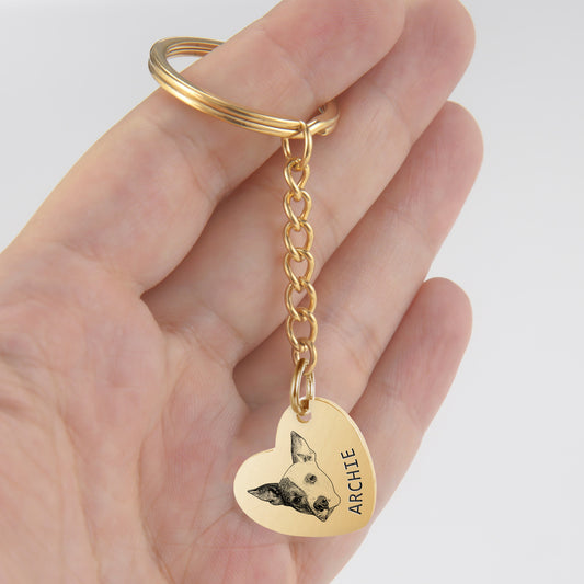 Custom Heart Pet Portrait Keychain with Name Engraved