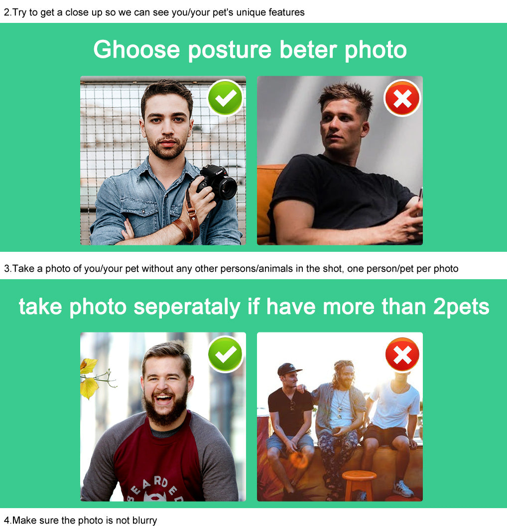When taking pictures of yourself, you loved ones, pets, please follow these steps! If you can’t follow the steps correctly, don’t worry! We have an enthusiastic team responsible for checking all orders and photos received. If your photos do not meet our standards, we will let you know and assist you in choosing a more suitable photo! You can send your photos to support@oarse.com also.