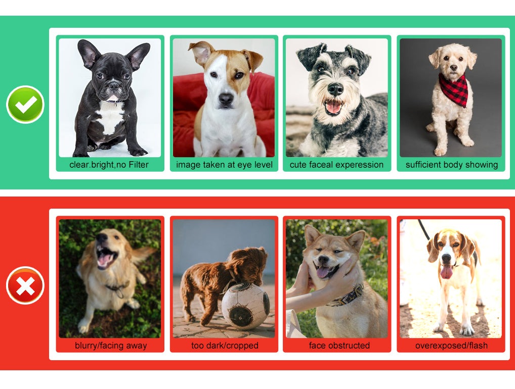 We provide free color correcting photo service, free edting in of small areas missing from photo(s) including paws, tails, ears, etc. We can not combine features from photos at different angles.
